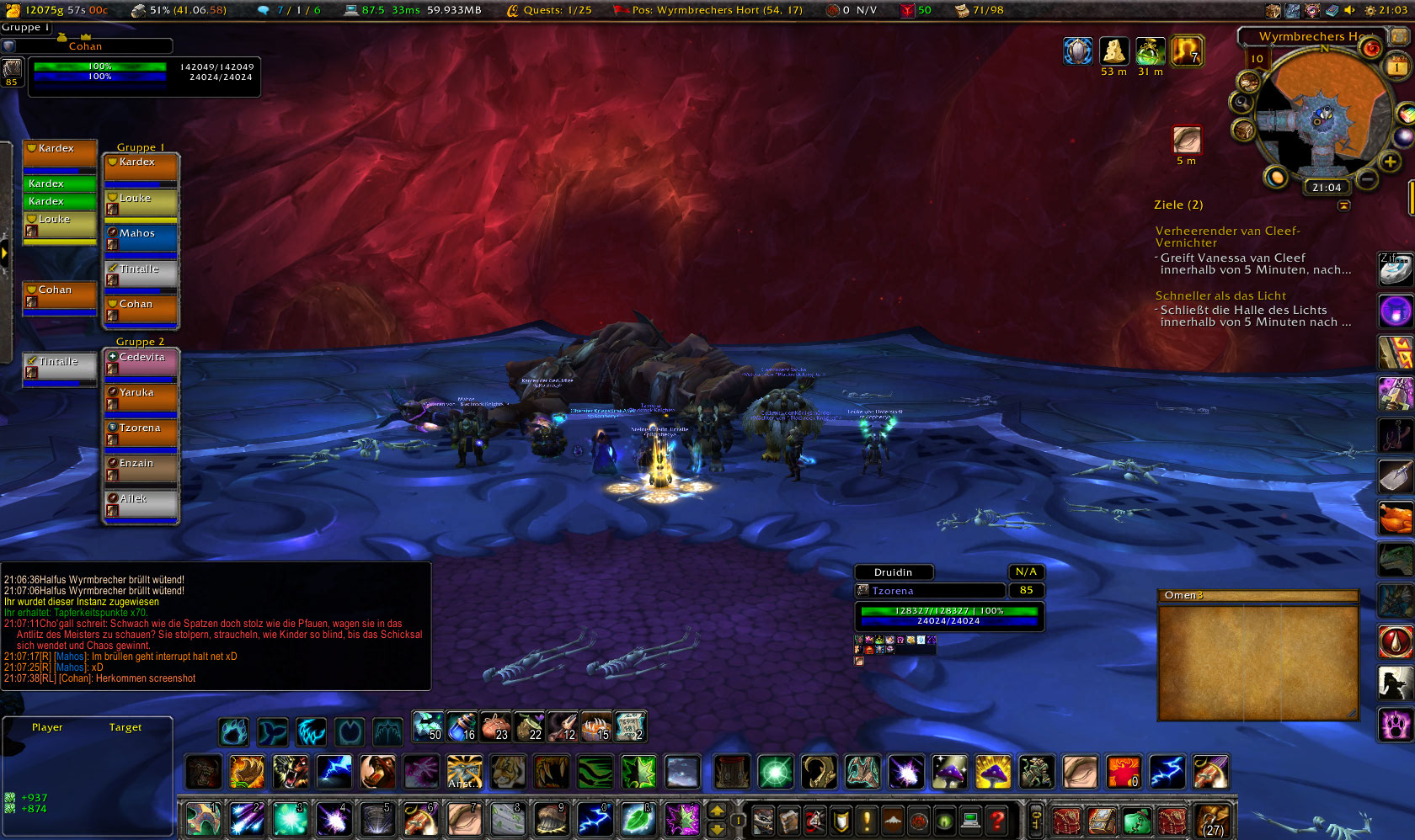 Am heutigen Abend wurde erstmals die Bastion des Zwielichts in Angriff genommen und nach nur wenigen Minuten musste sich der erste Boss Halfus in dieser Instanz geschlagen geben. Das Drachen Duo konnte unsere Angriffe diese Woche noch abwehren, allerdings gegen eine geschwächte Raidgruppe, die nur noch 9 Mann umfasste. Im Mute der Verzweifelung konnten auch hier knapp 30% am Ende erreicht werden.